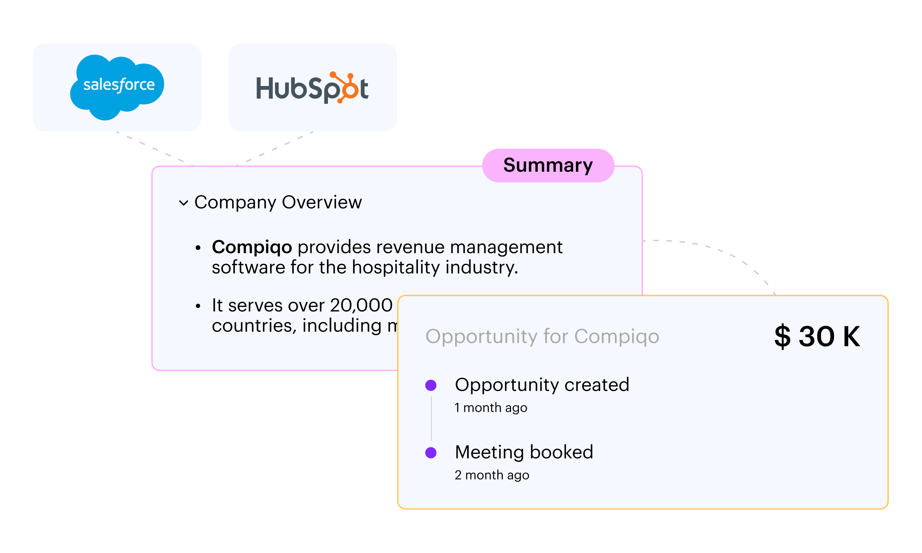 Get all the background you need—without extra clicks. Signals Center pulls in key company details and account background from your CRM, saving time and keeping your team focused on selling, not busywork.