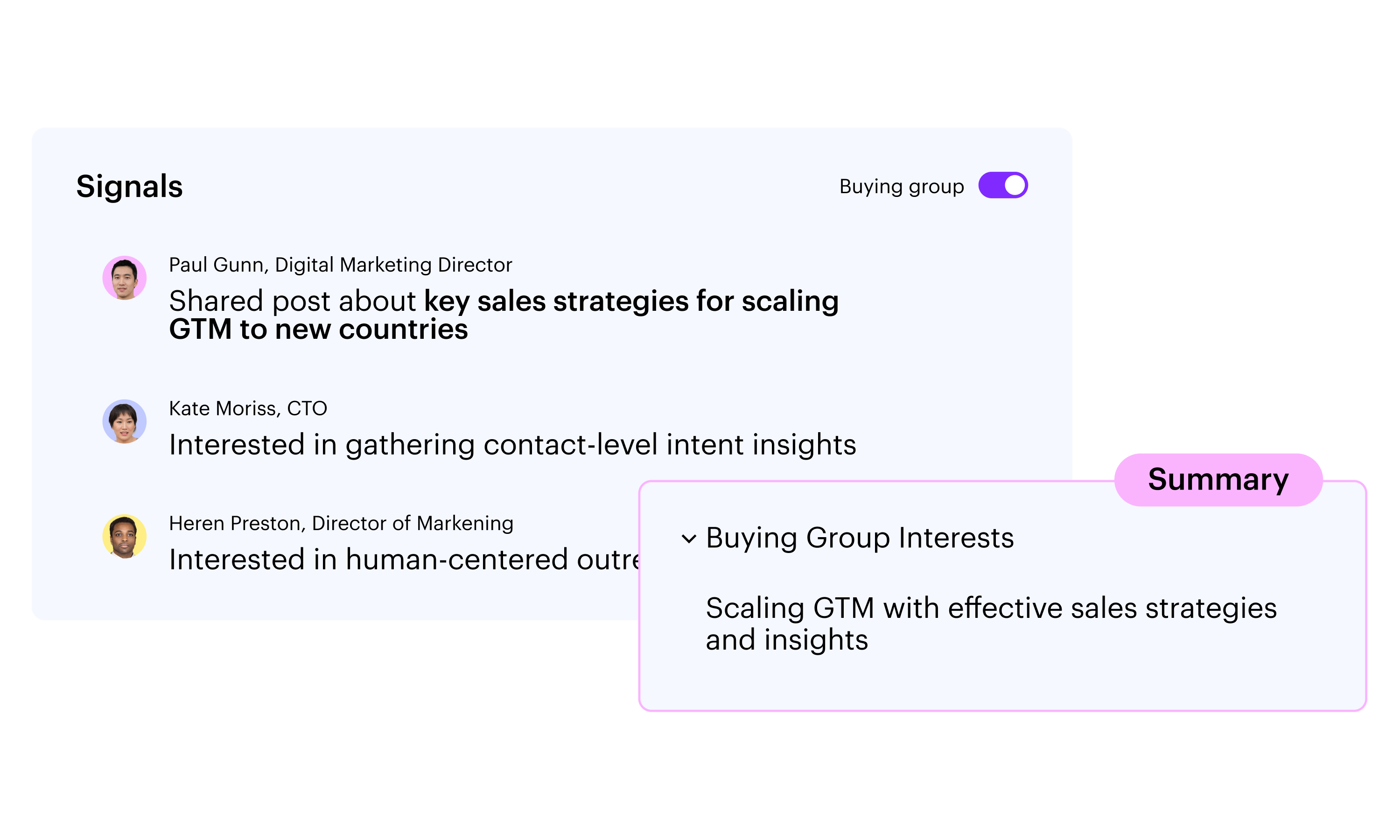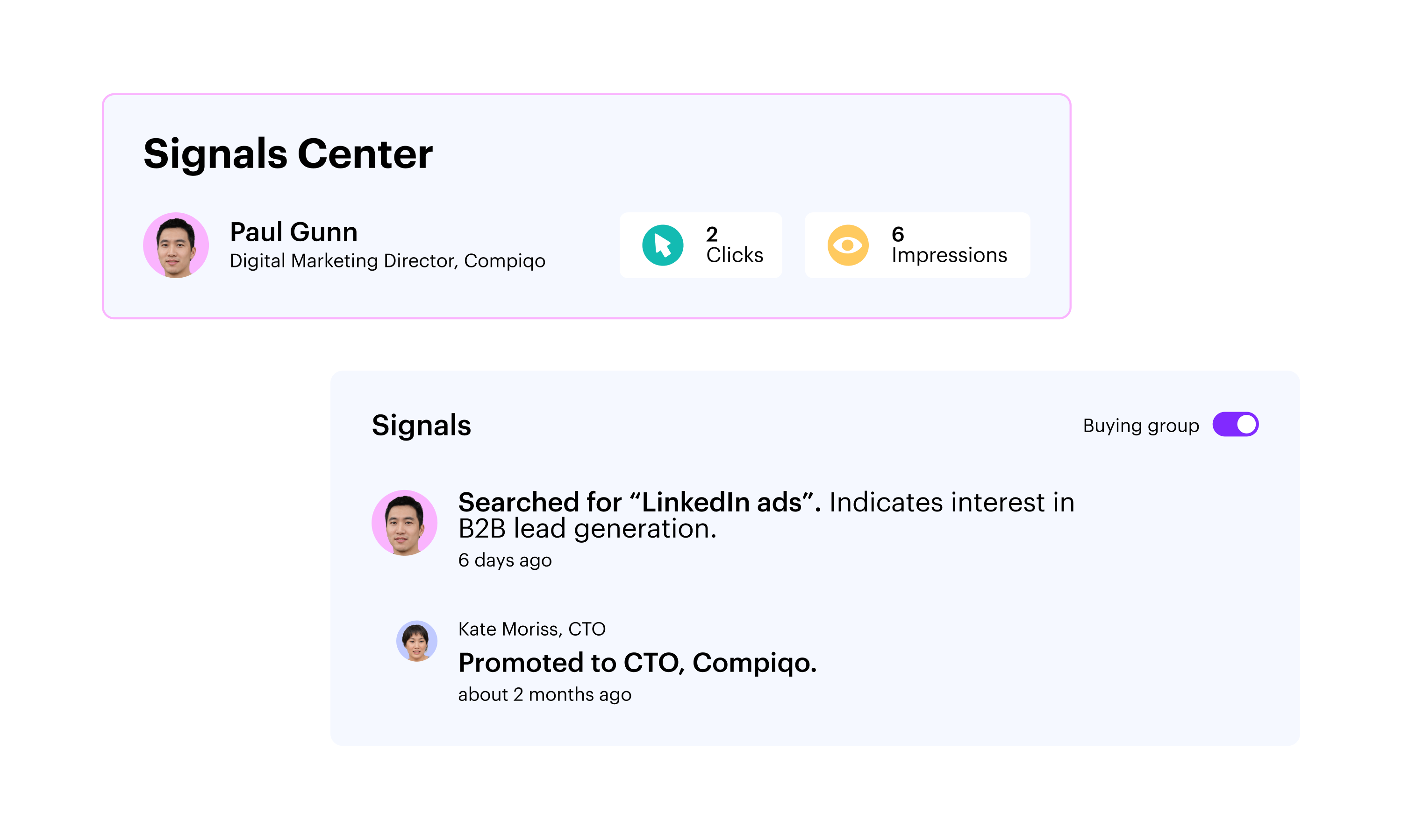 The buyer’s journey is complex, often driven by a team of champions. Signals Center connects signals across the company to reveal the buying group’s true priorities.